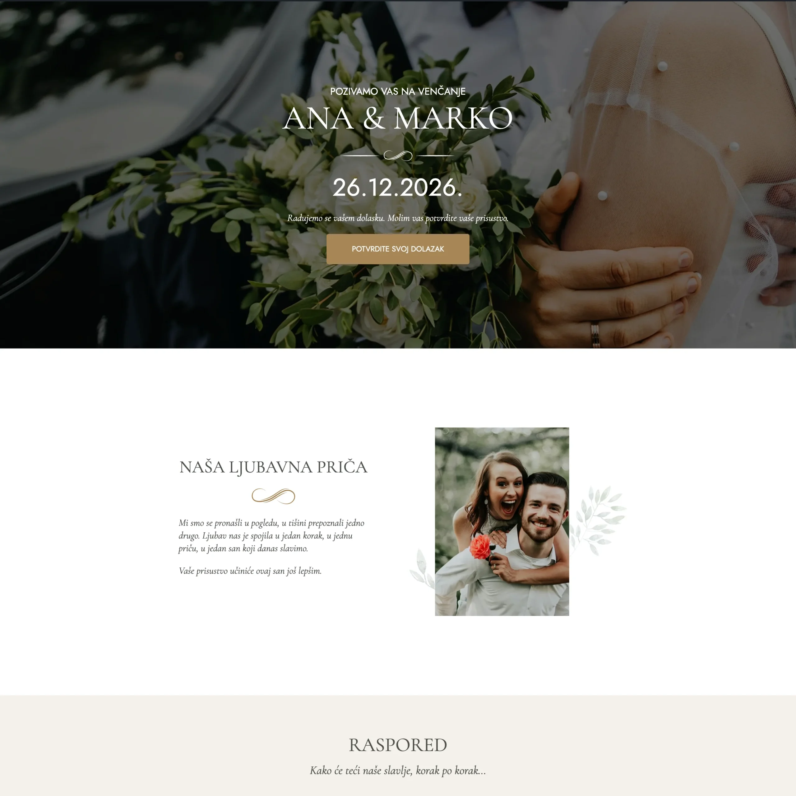 Odaberete dizajn, izvršite porudžbinu, a zatim zajedno prilagođavamo sadržaj – tekst, fotografije, datum i dodatne opcije poput potvrde dolaska, „Dodaj u kalendar“ dugmeta, galerije ili prilagodljivog dizajna.