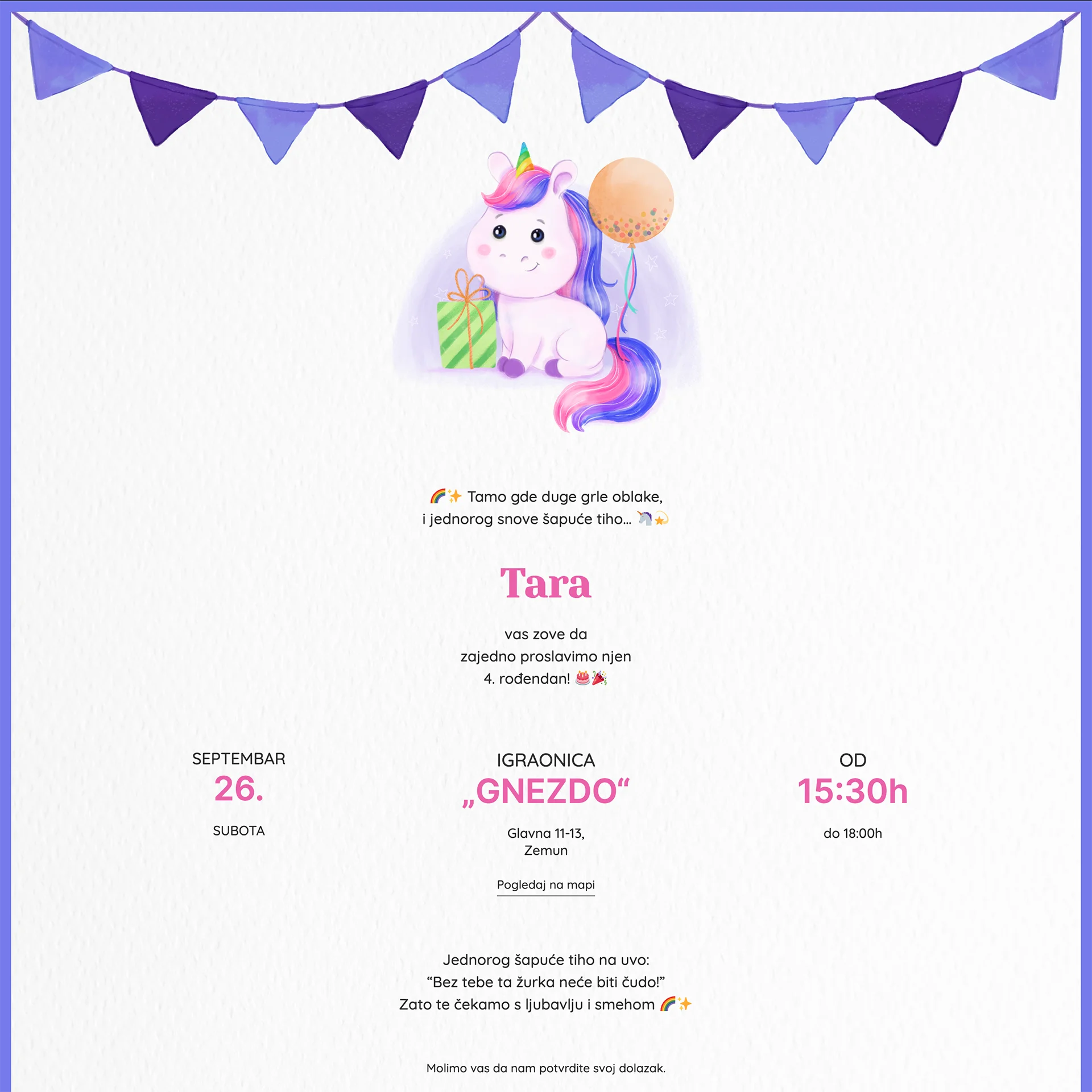 Mladenci – Beograd“Za prvi rođendan naše devojčice želeli smo nešto moderno i praktično. Web pozivnica je bila preslatka, potpuno personalizovana i laka za deljenje putem Vibera i WhatsApp-a. Svi su pohvalili ideju digitalne pozivnice."