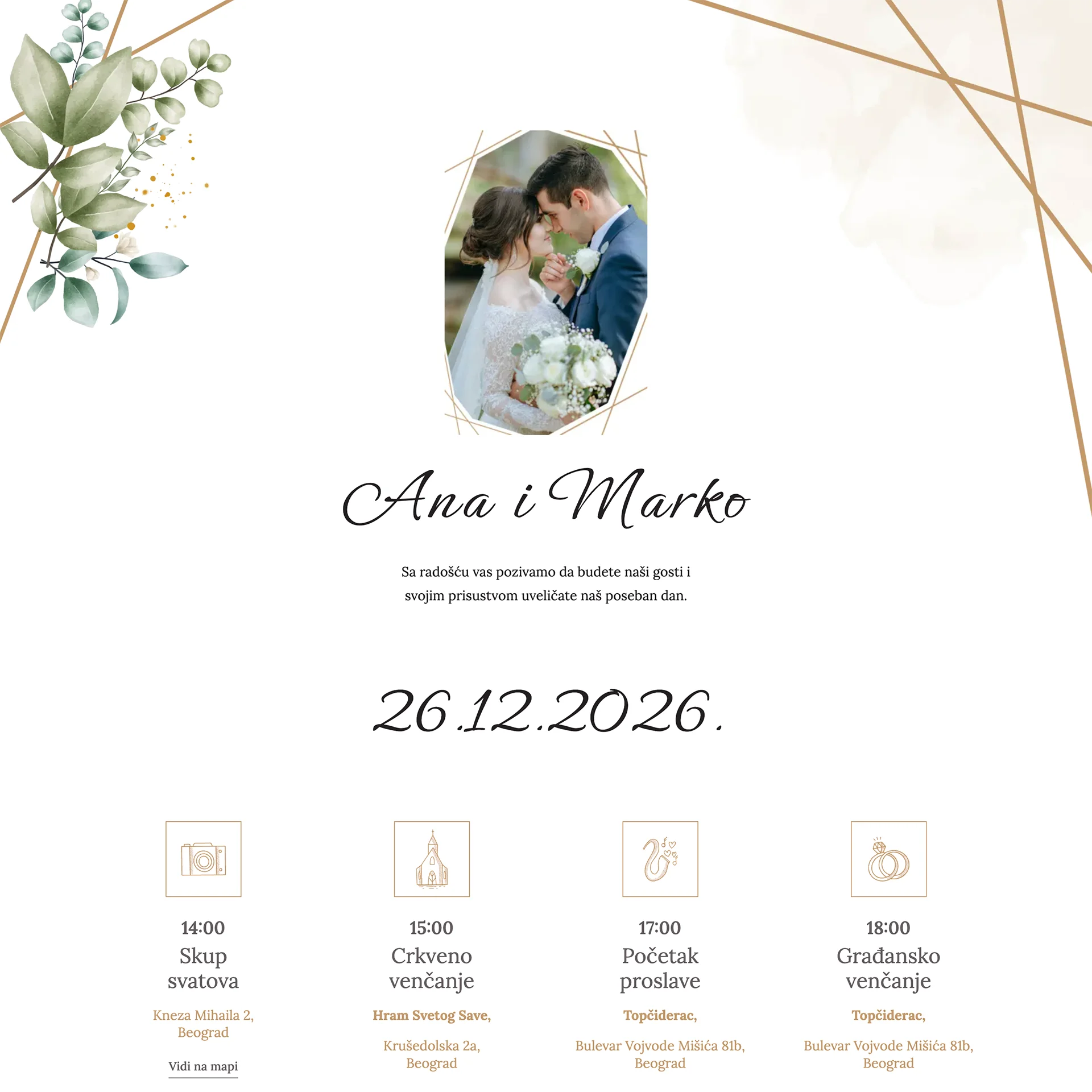 Mladenci – Niš“Pozivnica je bila prelepa! Gosti su odmah mogli da potvrde dolazak i vide tačnu lokaciju. Sve je izgledalo elegantno i moderno — baš kao što smo želeli.”