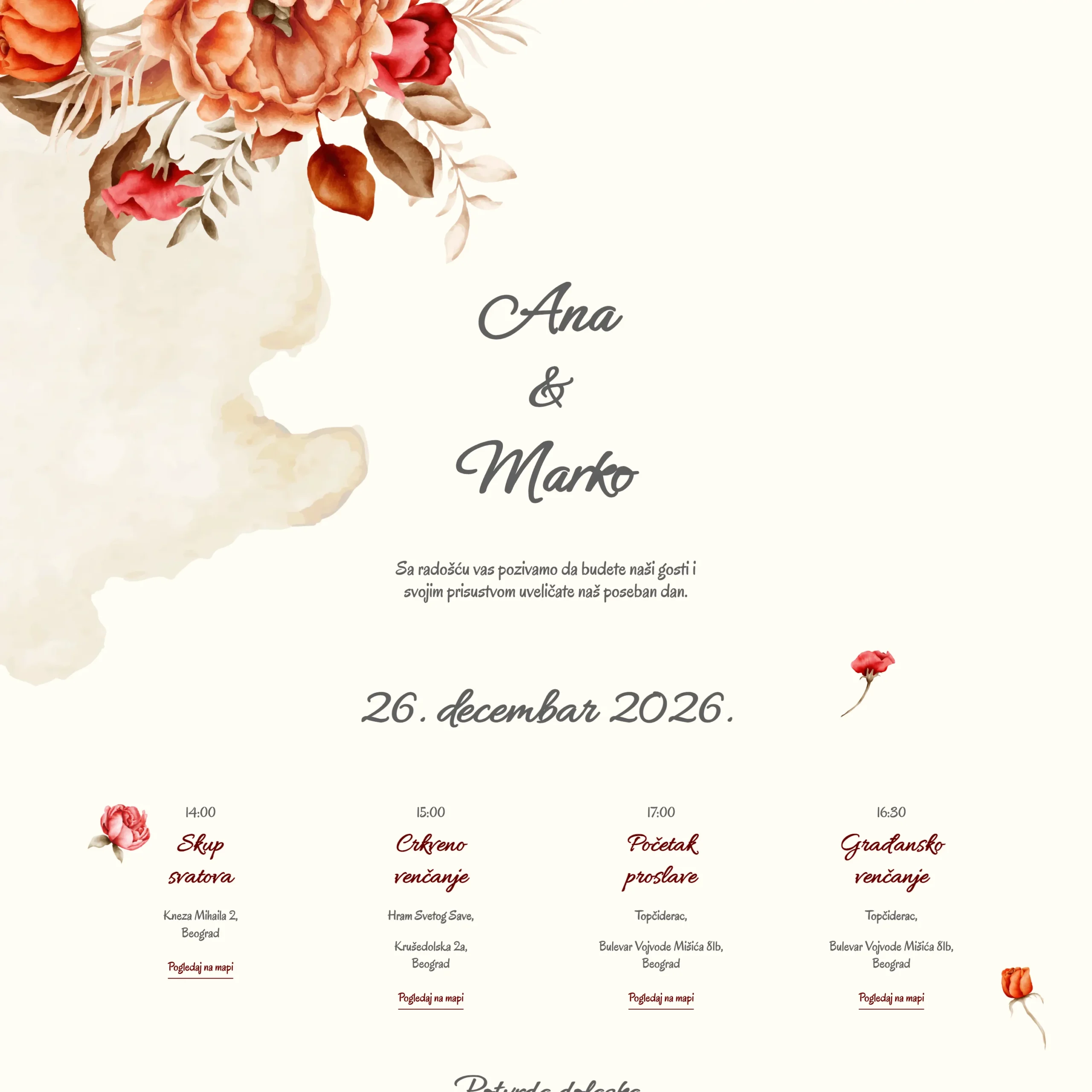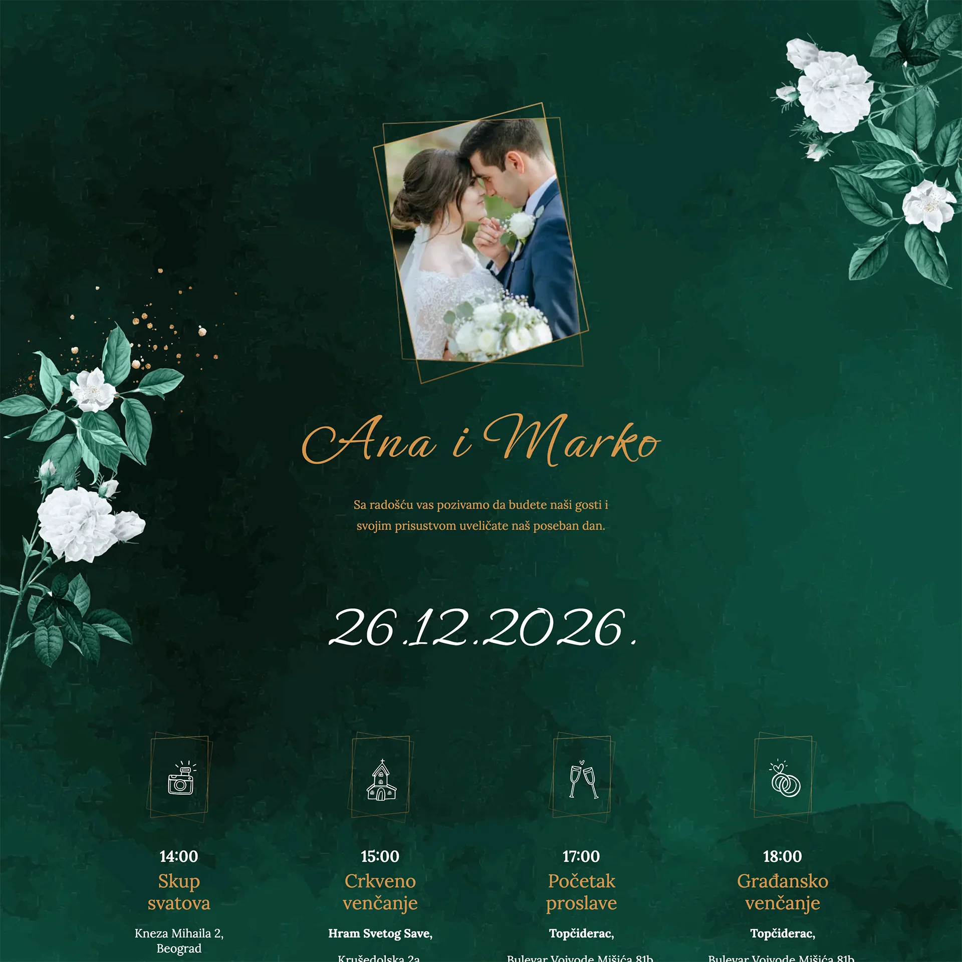 Beograd“Elektronske pozivnice su nam omogućile da brzo i lako obavestimo goste, čak i one iz inostranstva. Web pozivnica je izgledala profesionalno, a komunikacija je bila jednostavna. Idealno rešenje za moderno venčanje."